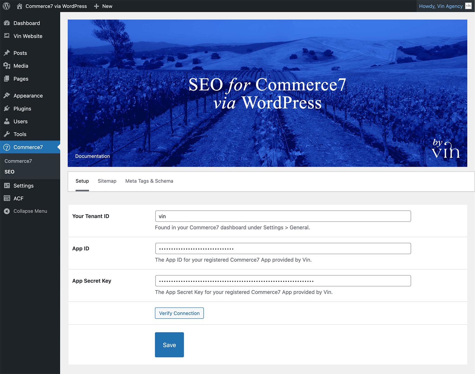 Setup is a two part process in Commerce7 and WordPress. After purchasing a plugin license, Vin will enable you to install the app in Commerce7 and follow up with information about installation.