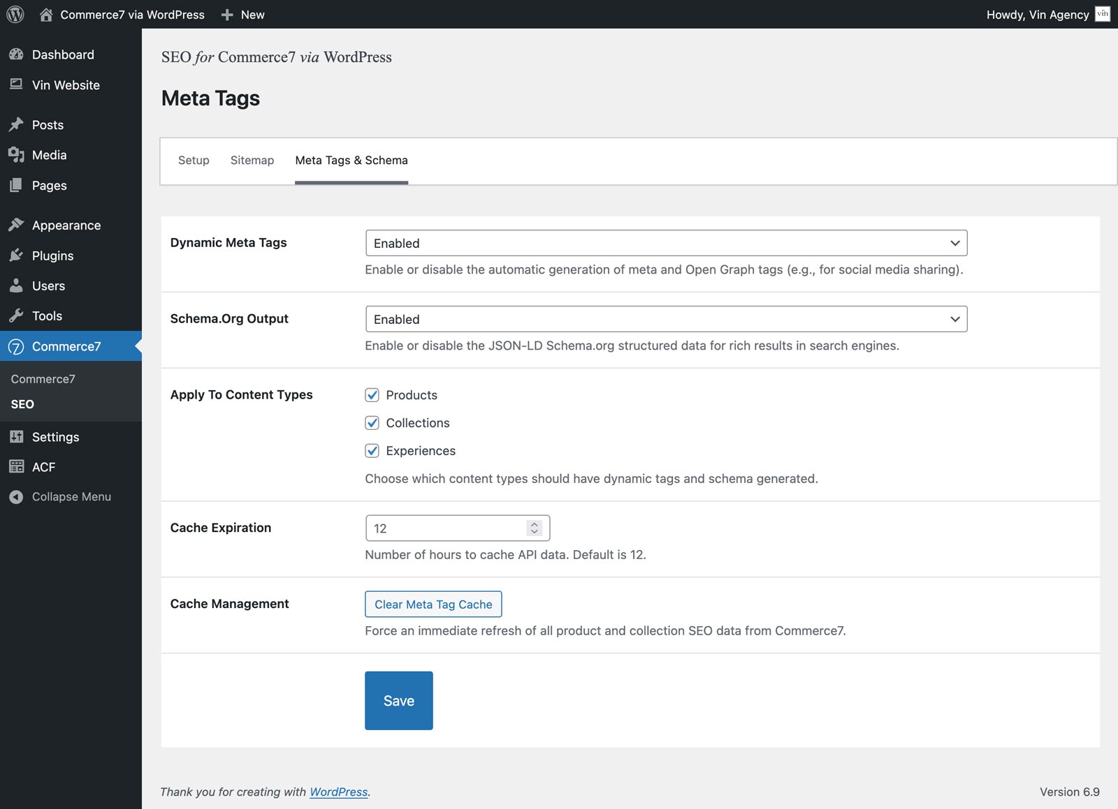Optionally clear the Meta Tag Cache to invalidate the cache and automatically refresh data from Commerce7’s APIs.