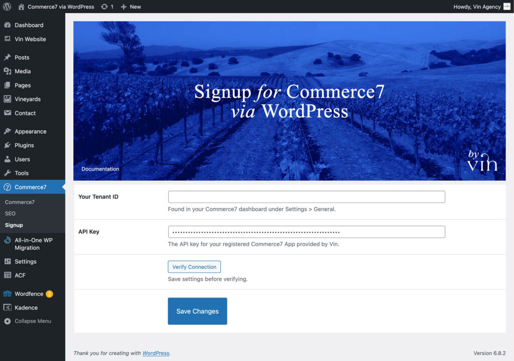 Setup is a two part process in Commerce7 and WordPress. After purchasing this plugin, Vin will enable you to install the app in Commerce7 and follow up with information about installing the plugin in WordPress.